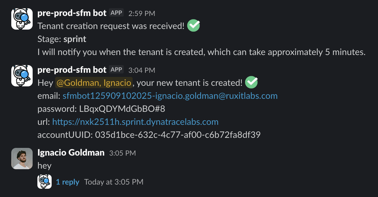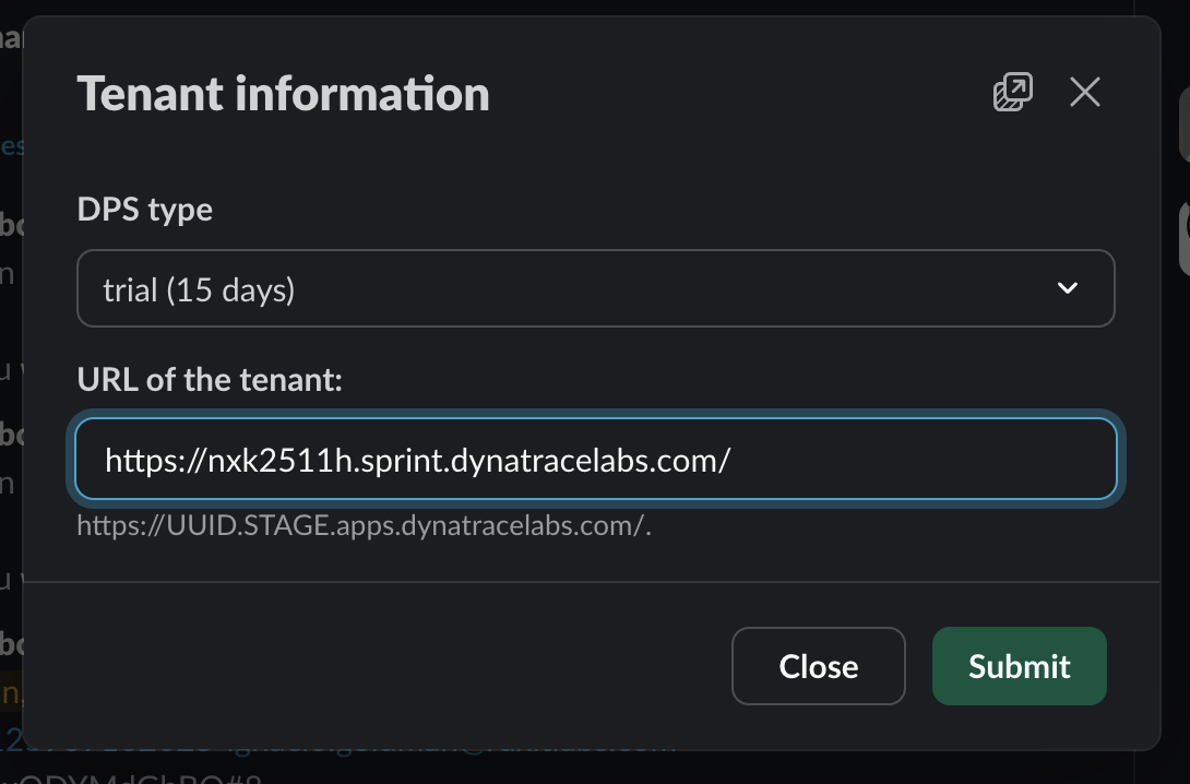 If you've created the tenant following the previous steps, the admin user is not your dynatrace email, but the one provided within the details in the slack conversation with the bot.